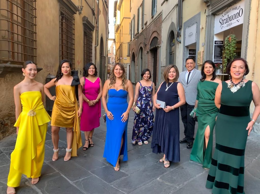 Chosen Family of AC Old Girls in Lucca, Italy l-r: Carmela Orozco Seranilla, Keesa Ocampo; Kristine Lapez Biti; Steph Lapez; Melissa Orozco; Elvira Lapez with spouse Genju Lapez, Anna Lukban (Keesa’s mom, from ACHS 1975) & Wendy Erum