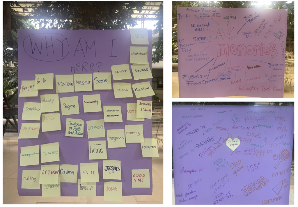 At the heart of the gathering was the reflective question — “Why am I here?” From this, voices rose with sincerity and hope, forming a tapestry of meaning. Impactful words like serve, mission, prayers, faith, courage, and calling echoed the Assumption woman’s enduring commitment to live with purpose. Others spoke of sisterhood, friendship, connection, home, comfort, and good vibes — affirming that Assumption is more than a school; it is a place where bonds are nurtured and lives are intertwined. Still, many expressed the personal journey of growth, embracing intentional living, peace, happiness, resilience in faith and action, self-love, and completeness.