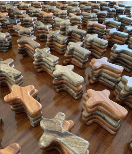 The concept drew from Mariann’s own practice of holding a small wooden cross in prayer. The gesture brought calm and presence, even when words failed. Inspired, the trio reached out to the San Simon community in Pampanga. With the help of Sr. Maitel Roceles and Sr. Josefina Magat, they connected with Mang Orly. Orly Pagcu is a vocation-teacher, who is now the General Services Coordinator, hand-carved each piece in Dao and Mahogany wood.